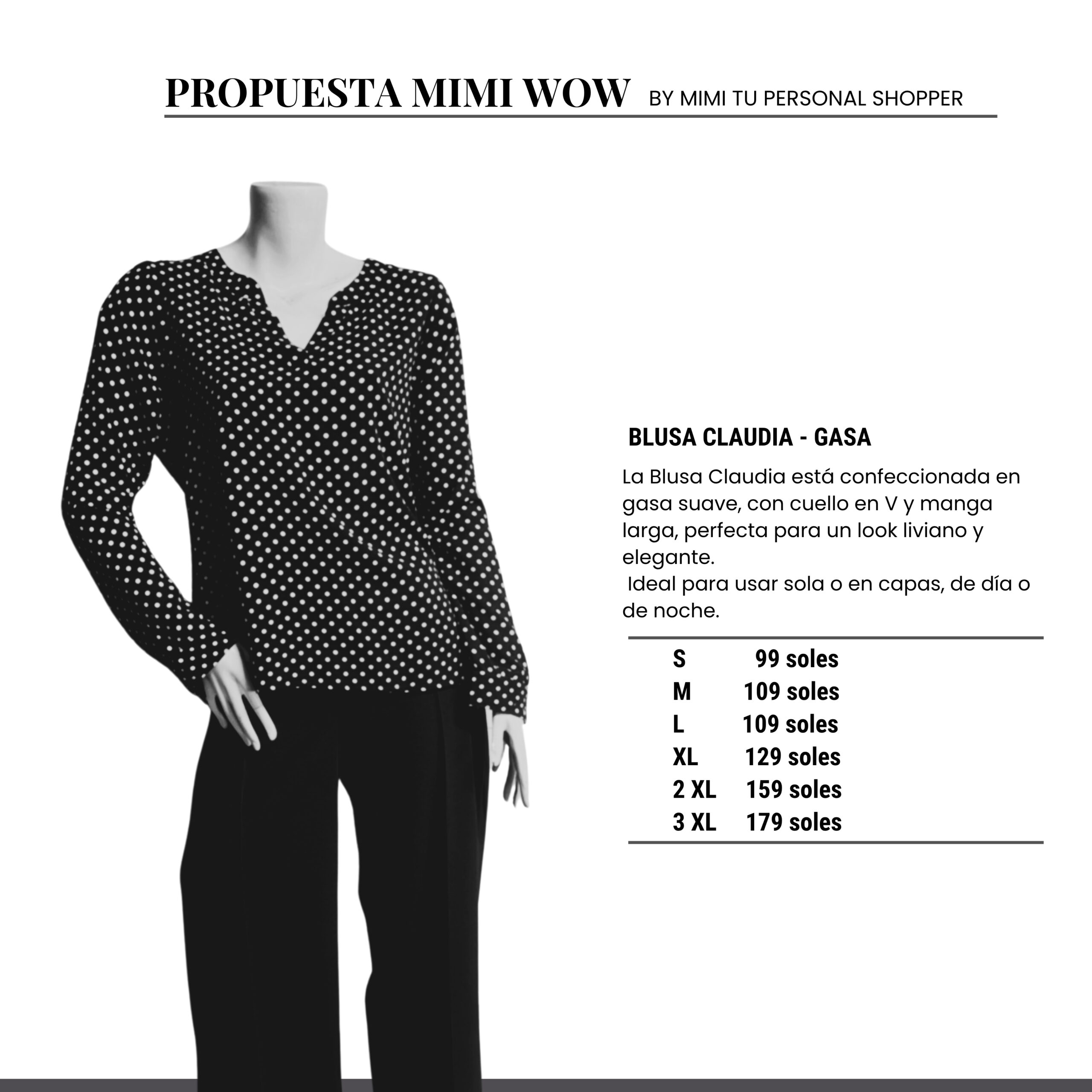 La Blusa Claudia está confeccionada en gasa suave, con cuello en V y manga larga, perfecta para un look liviano y elegante.