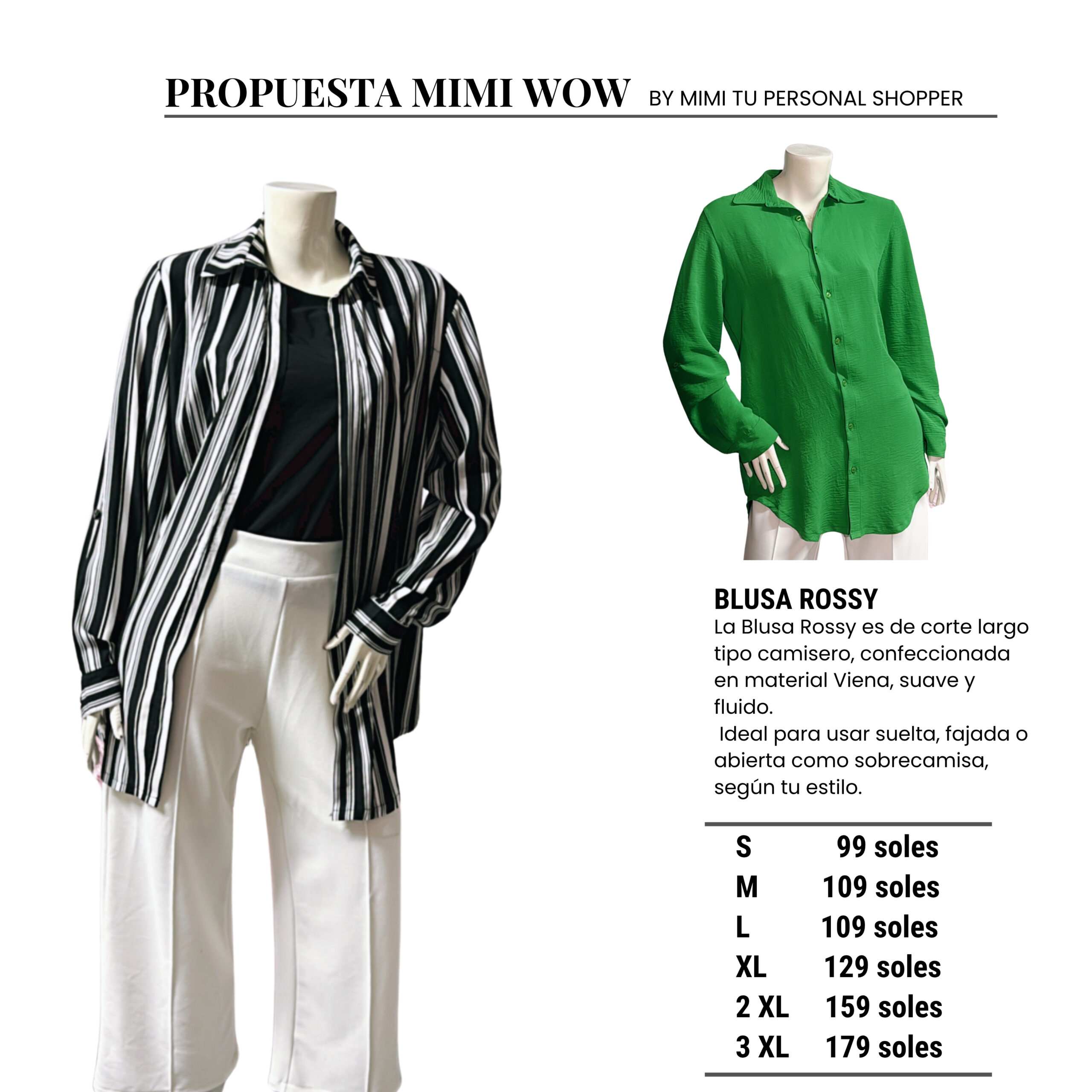La Blusa Rossy es de corte largo tipo camisero, confeccionada en material Viena, suave y fluido.