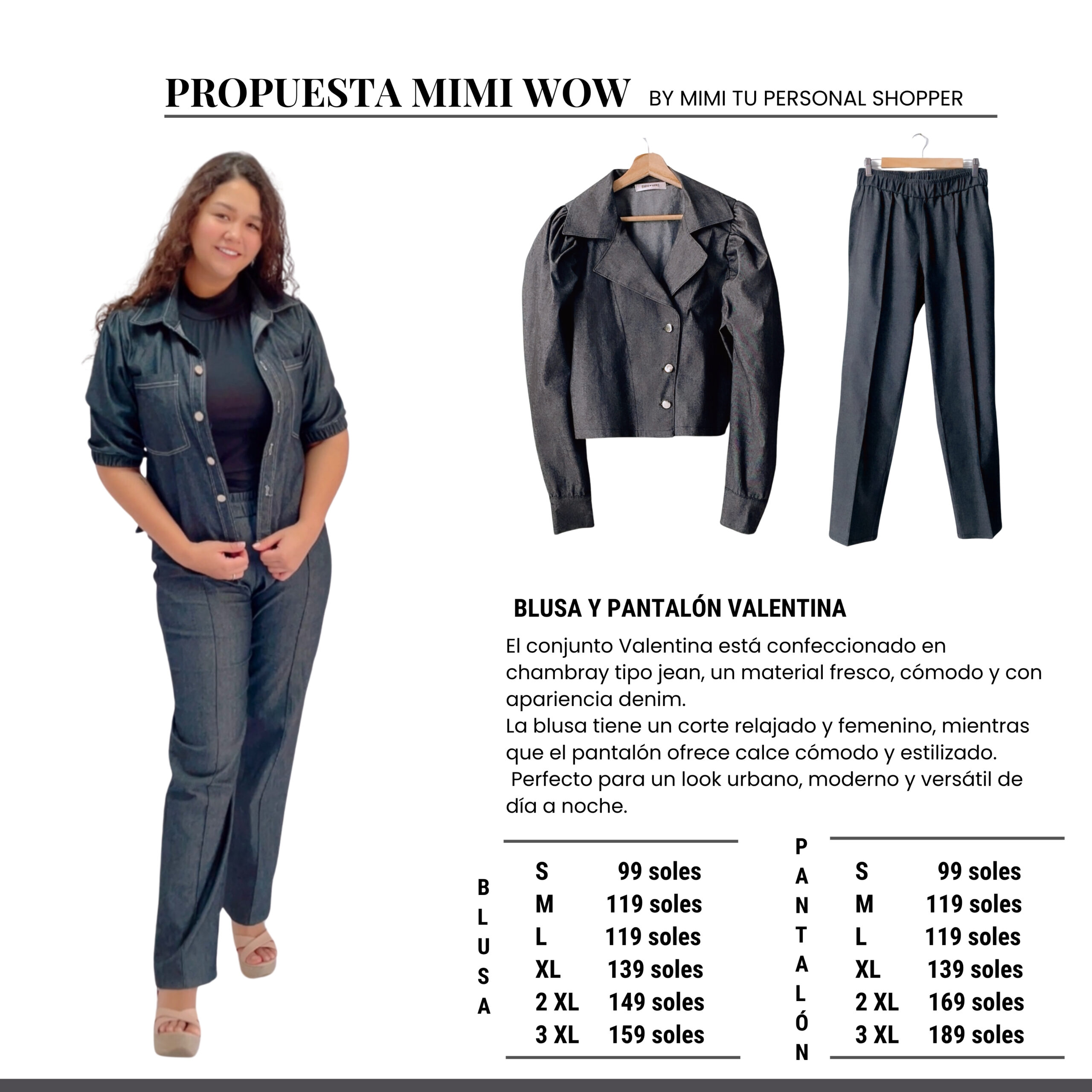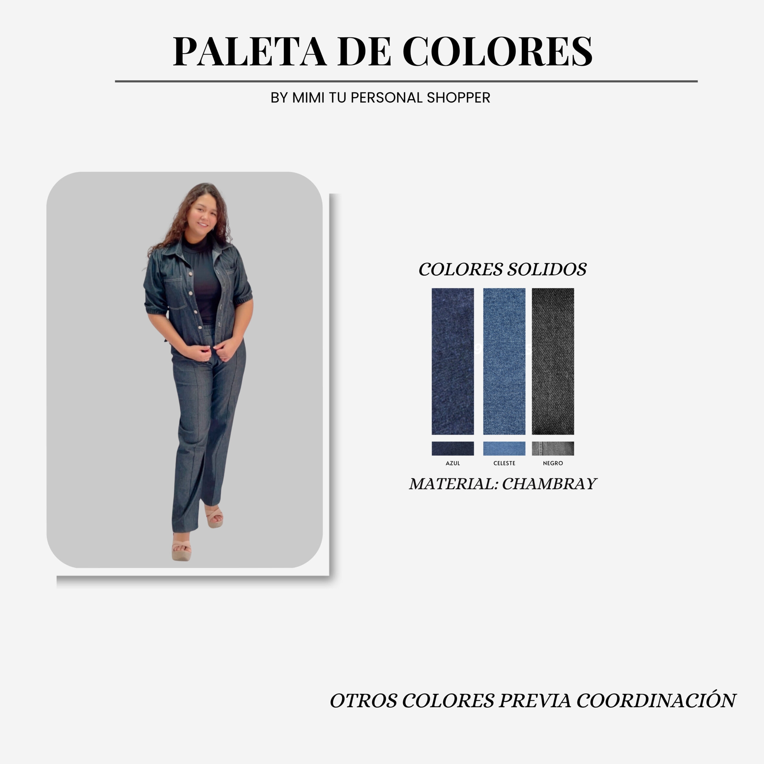 El conjunto Valentina está confeccionado en chambray tipo jean, un material fresco, cómodo y con apariencia denim.