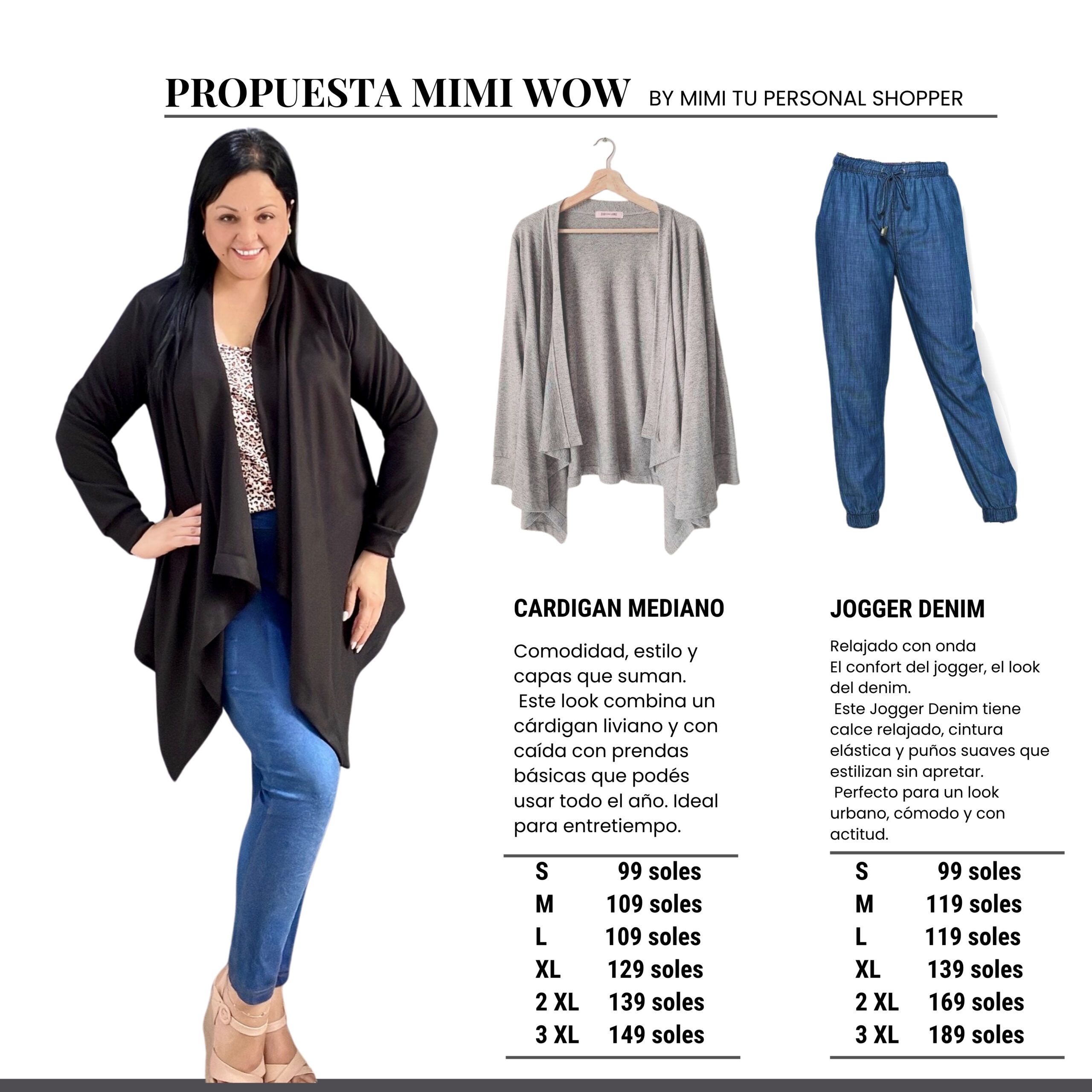 Este look combina un cárdigan liviano y con caída con prendas básicas que podés usar todo el año. Ideal para entretiempo.