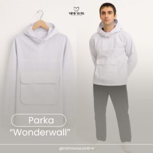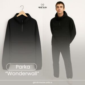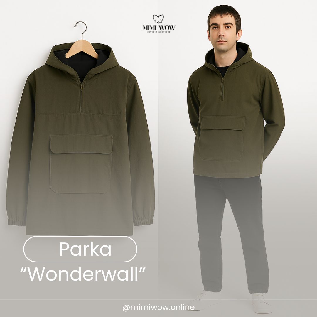 Parka impermeable/cortavientos de tela nova corrugada, con cierre medio, capucha amplia y 1 bolsillo amplio en el centro.