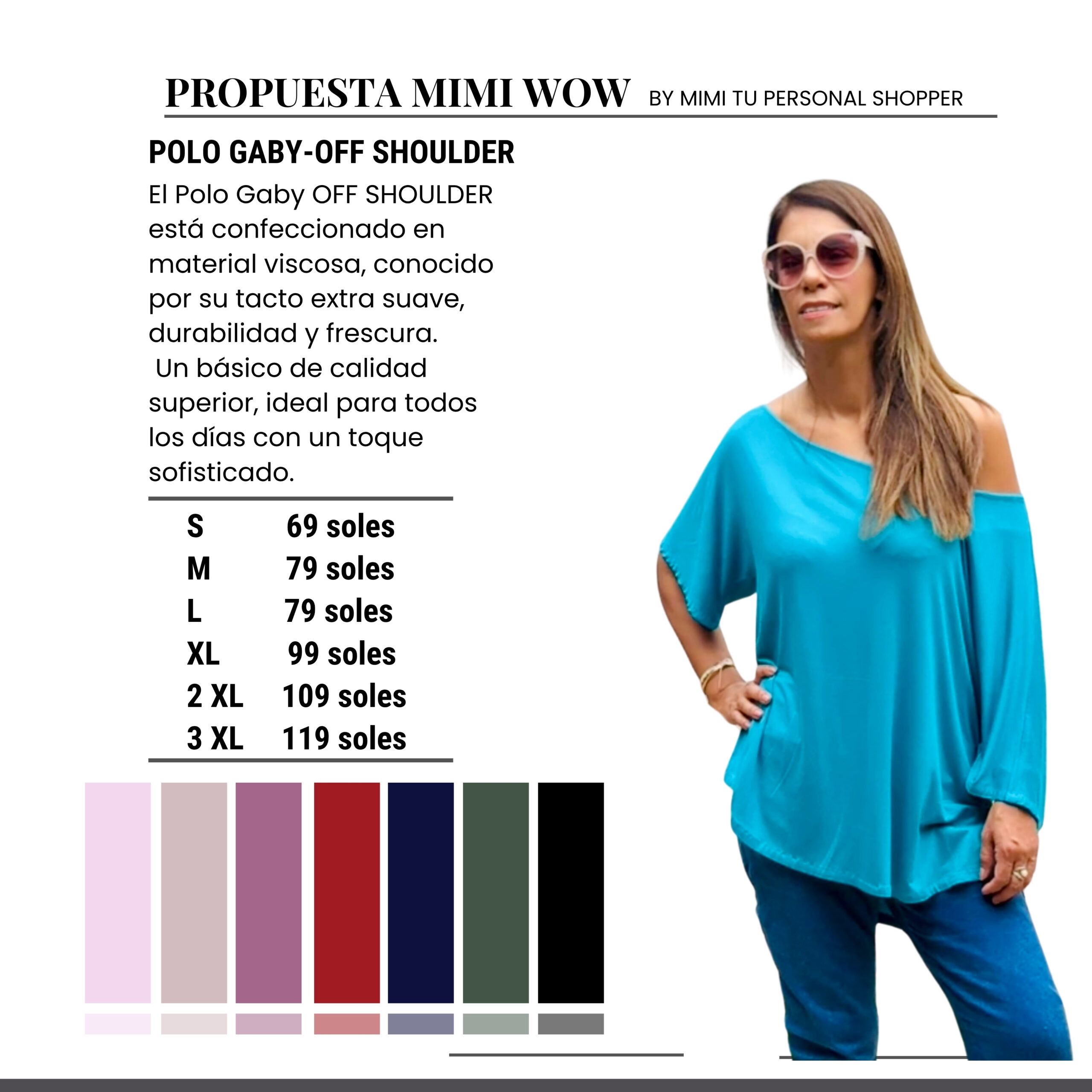 El Polo Gaby OFF SHOULDER está confeccionado en material viscosa, conocido por su tacto extra suave, durabilidad y frescura.